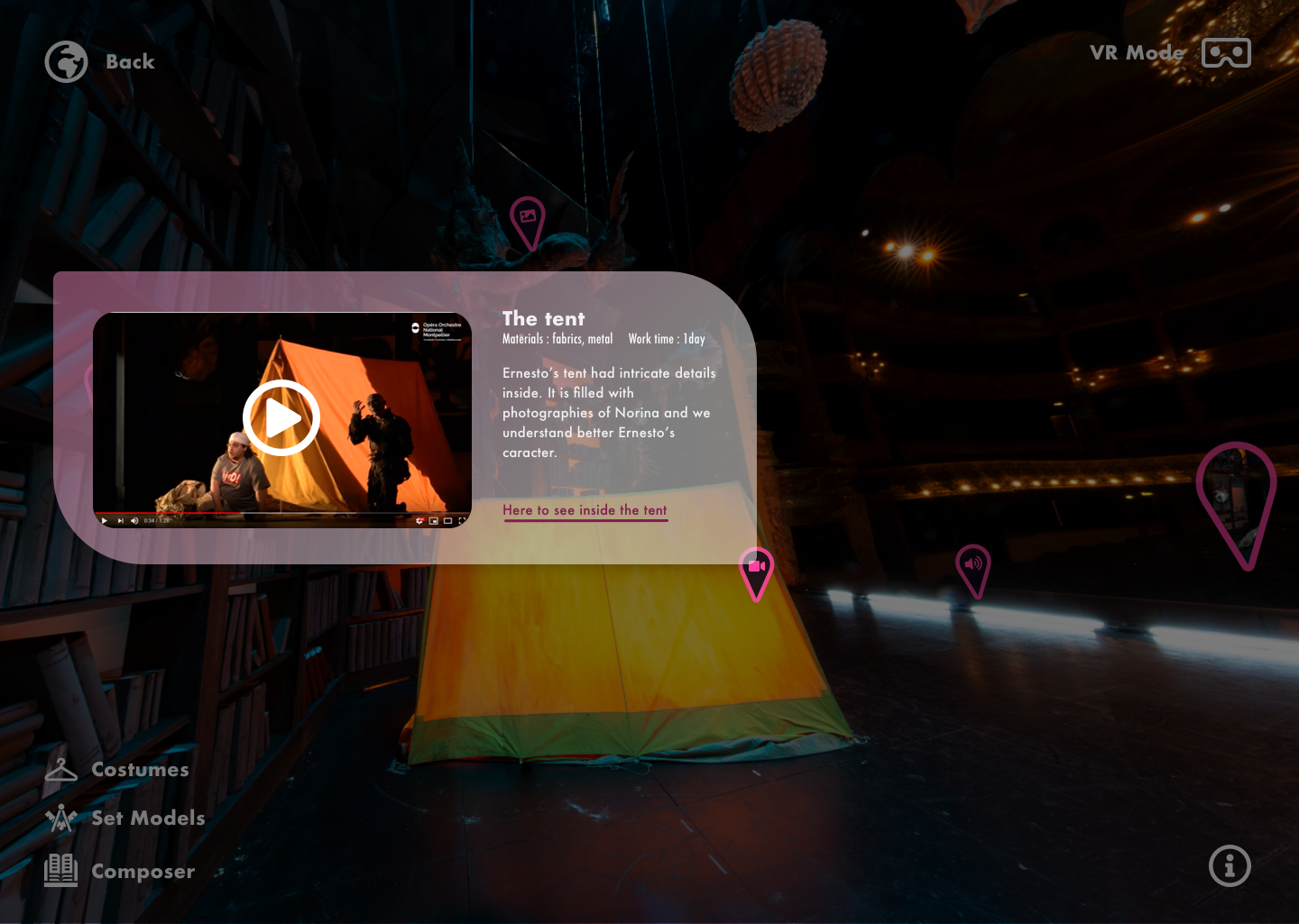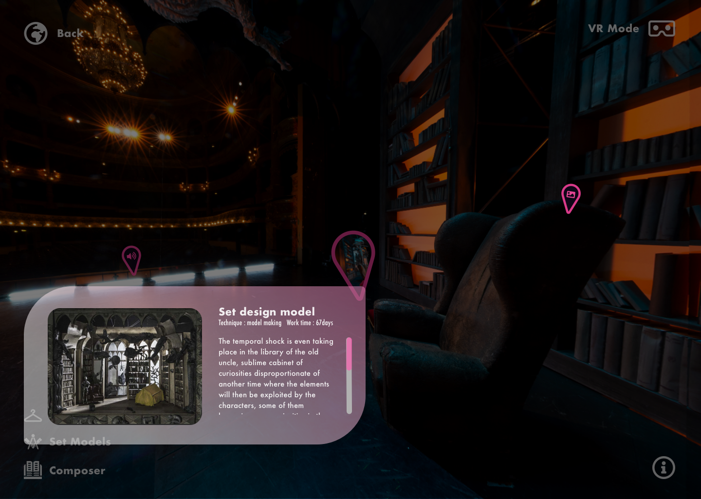 By saving ephemeral installations, Viviscim is an innovative archiving extension for live art. It draws its inspiration in the virtual visits already successfully offered by many theaters all around the world, but aims to focus on the one thing that is truly ephemeral and seems to fascinate the audience : the production set. With Viviscim, the user can easily navigate in the set recreated with a high resolution imagery, and discover an in-depth informative and educational content on the stage direction, the set elements, the music and its composer, the libretto and the dramaturgy. Thanks to a close collaboration with opera houses teams, Viviscim highlights the set richness and details and offers expert contents.