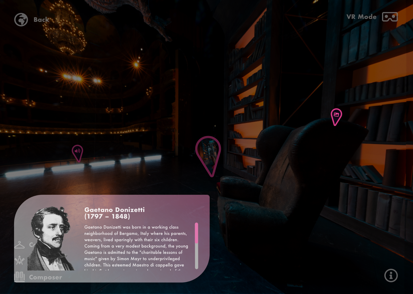 Viviscim (VIrtual VIsit SCenic IMmersive) is a multilingual web application inviting users to discover the scenic art through the sets and backstage of opera houses key productions, in an immersive 360° Virtual Reality experience.